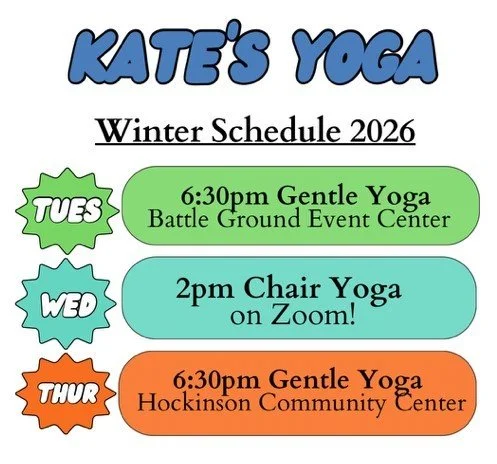 YOGA: Kate teaches in-person group Gentle Yoga Classes at the Battle Ground Event Center, and at the Hockinson Community Center in Washington. She also offers live-streamed zoom-based public and private yoga classes as a way for more people to enjoy yoga in the comfort and safety of their homes. Kate understands the needs of people working through physical challenges, especially those students starting yoga at age 65 or better! She helps her yoga students to focus on what they can do safely, moving towards what feels good and nourishing. Creating a strong spirit of community, Kate's classes are playful, fun, and welcoming to everyone!